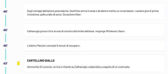 比賽的轉(zhuǎn)播畫(huà)面和意甲官網(wǎng)的文字直播原本都顯示吉爾摩在第43分鐘飛鏟恰爾汗奧盧犯規(guī)吃到黃牌,隨后第46分鐘這位蘇格蘭球星又拉倒鄧弗里斯破壞國(guó)米反擊再次染黃,正當(dāng)人們困惑為什么當(dāng)值主裁馬里亞尼沒(méi)有向吉爾摩出示紅牌的時(shí)候,意甲官方隨后對(duì)他們的文字直播內(nèi)容進(jìn)行了更正,他們將第一張黃牌的得牌球員更改為了迪洛倫佐。