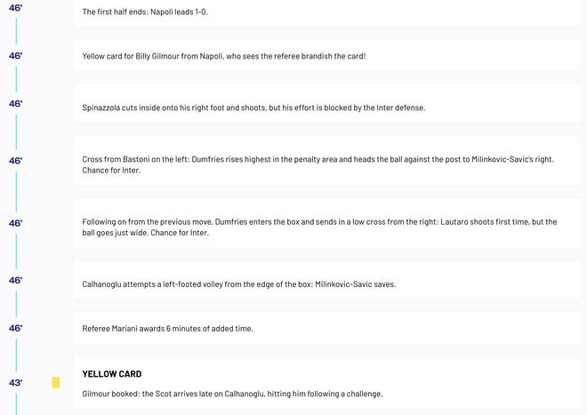 北京時(shí)間10月26日,在意甲第8輪的焦點(diǎn)戰(zhàn)中,那不勒斯依靠一粒爭(zhēng)議點(diǎn)球在半場(chǎng)過(guò)后主場(chǎng)1-0領(lǐng)先于國(guó)際米蘭,除了點(diǎn)球判罰以外,意甲官網(wǎng)的文字直播也給前45分鐘的比賽進(jìn)一步增加了話題性。