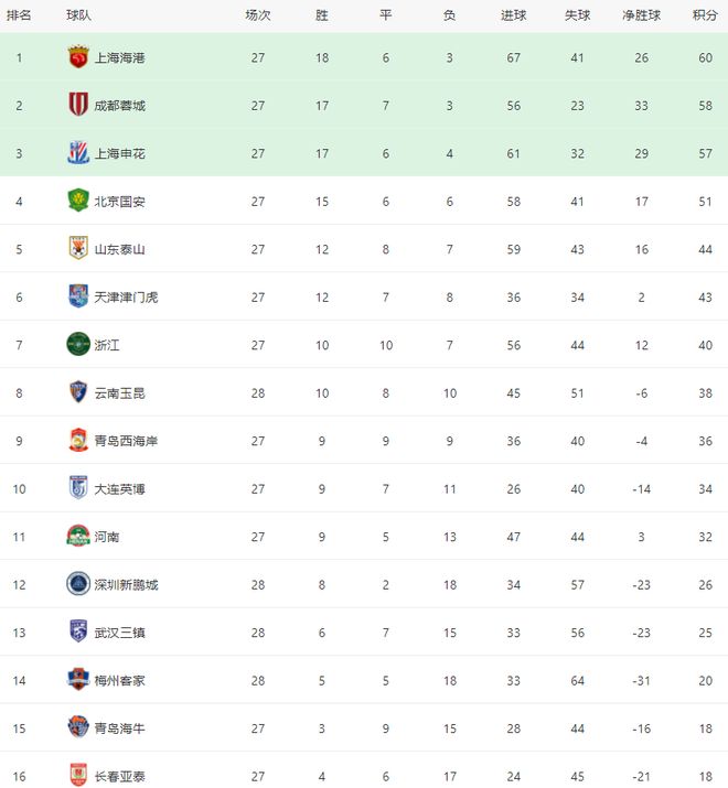 在積分榜上,上海海港以60分排名榜首。成都蓉城緊隨其后,拿到58分。上海申花以57分排名第3。冠軍的爭奪還是非常激烈。雖然上海海港占據(jù)優(yōu)勢,但接下來的比賽不容有失,一旦丟分很可能就被擠下去。而保級形勢也是比較亂。深圳新鵬城26分基本保級成功。武漢三鎮(zhèn)25分排名第13。梅州客家拿到20分,排名倒數(shù)第3。長春亞泰以19分排名倒數(shù)第2。倒數(shù)第1的是青島海牛,少踢1場,拿到18分。