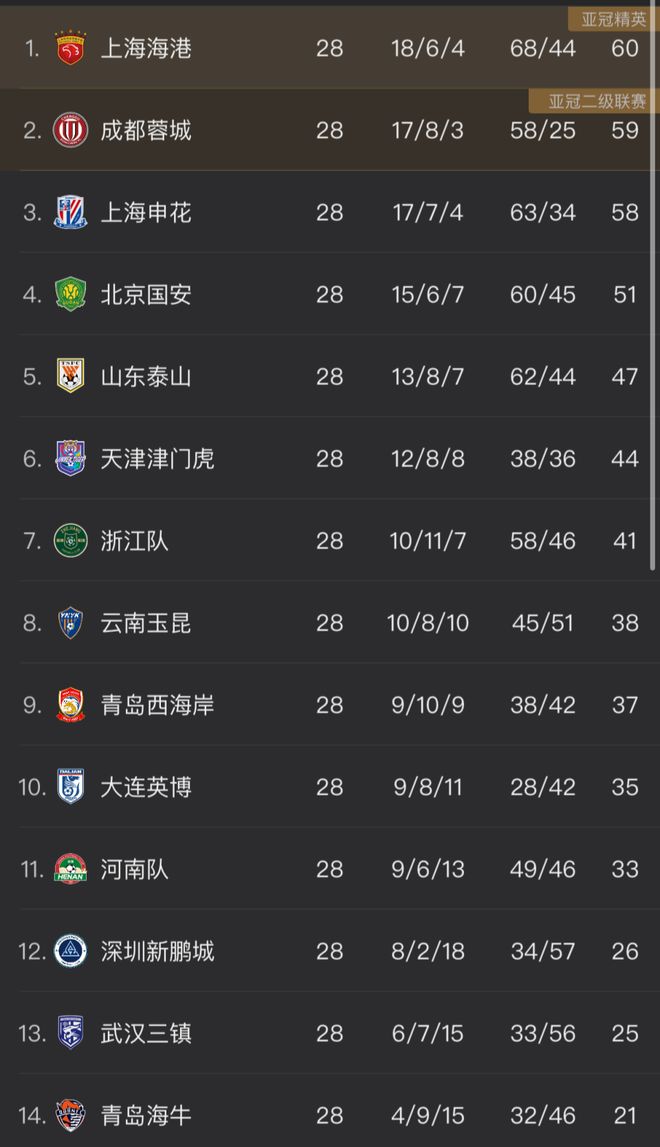 本輪過后,60分的海港依然領(lǐng)跑,不過領(lǐng)先優(yōu)勢(shì)縮小至1分。蓉城積59分排名第2位,申花58分排名第3。依然保持爭(zhēng)冠希望的2隊(duì),將在最后2輪展開決戰(zhàn)。
